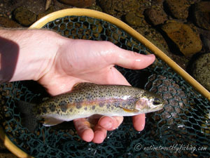 McCloud River Redband Trout have an olive or bronze coloration on their backs. Their sides are a yellowish to golden color that may be quite intense and fades toward the ventral region, with an orange coloration found on the bellies of some sexually mature individuals. Like other Redband Trout, McCloud River Redband may exhibit cutthroat marks under their jaws. These fish get their name Redband from a pink to brick red stripe along their lateral line. Their gill plates are a rosy or brick red color which is rather intense on some individuals. McCloud River Redbands are heavily spotted above the lateral line and have a few spots below. Purplish colored elliptical shaped parr marks are often retained into maturity on stream resident fish but fade on migratory fish. The dorsal fin may be tipped with either orange or white and the lower fins are tipped with white.